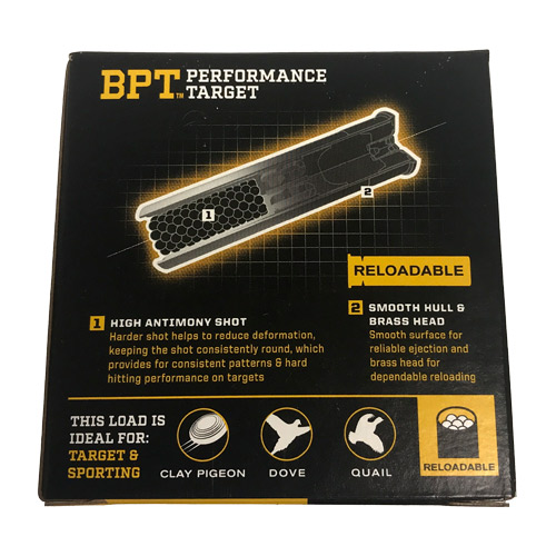 The browning bpt 28ga 23/4` 3/4oz #7.5 25rds reloadable shotgun ammunition features high antimony shot. Harder shot helps to reduce deformation keeping the shot consistently round, which provides for consistent patterns & hard hitting performance on targets. Smooth hull & brass head provide a smooth surface for reliable ejection and brass head for dependable reloading. This load is designed for target and sporting.