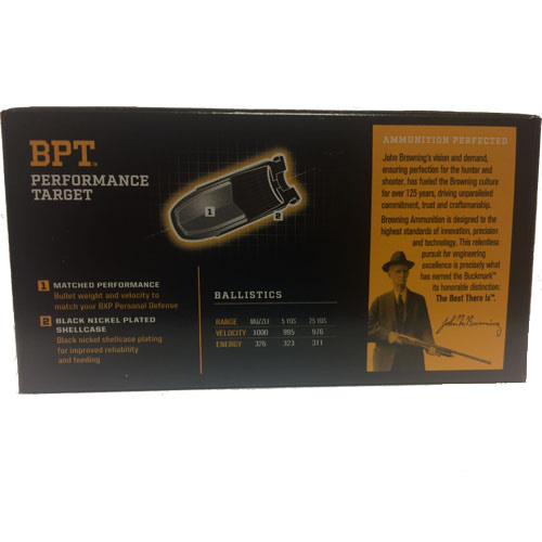 The Browning Bpt 9mm 147GR Pistol Ammunition is a premium training ammo that can be used to practice your handgun skills. It is a matched training counterpart to BXP Personal Defense. Confidence at the range with BPT Performance Target means confidence in real personal defense situations. The Browning Performance Target 9mm 147GR Handgun ammo features Black Nickel Plated Shellcase for improved reliability and feeding.