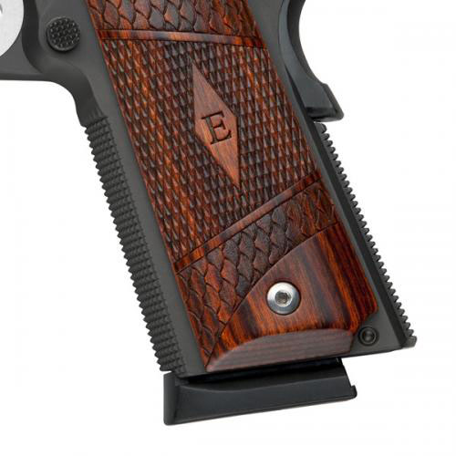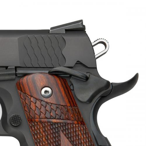 Smith & Wesson as one of America's oldest makers of fine, high quality firearms you would expect nothing less than one of the finest 1911 pistols on the market. Known as America's gun, and the pistol that fought and won 2 world wars. The 1911, designed by one of the greatest minds for firearms in history, John Moses Browning, is alive and as popular as ever. Enter the Smith & Wesson E-Series SW1911TA .45ACP, a full featured modern adaptation of the classic pistol, giving shooters a host of upgrades to bring the "old war horse" into the present. The Smith & Wesson SW1911TA .45ACP handgun comes standard with dovetail cut front and rear sights, which gives shooters a better sight picture with 3-dot night sights, and also allows the changing to an individual’s preference. Aggressive front strap checkering makes handling the SW1911TA .45ACP possible in any condition, while front slide cocking serrations allows alternative cocking options or "press checking". Ambidextrous manual thumb safety allows activation or deactivation of the safety easy in left or right handed shooters hands. The Smith & Wesson SW1911TA .45ACP features a frame mounted rail for attaching modern accessories like lights and lasers, perfect for Law Enforcement or civilian home defense in low light situations. Along with all the functional improvements, the S&W SW1911TA .45ACP is adorned with beautiful laminate wood grips with attractive checkering to allow this pistol to stand out in the crowd. Skeletonized hammer and trigger round out the crisp clean single action trigger of the SW1911TA .45ACP, making this pistol a perfect addition to the legacy of the legendary 1911.