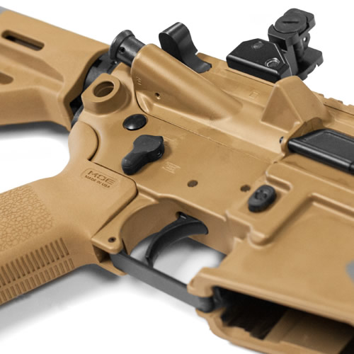 This model Sig Sauer 516 Patrol FDE Semi-Auto tactical rifle in 5.56 NATO has a 16” Nitride treated barrel. This 516 features Flat Dark Earth upgrades with a matching FDE Cerakote® finish on both the upper and lower receivers and aluminum handguard. The 516 Patrol FDE utilizes a short-stroke gas pushrod operating design. This drastically reduces fouling and debris in the chamber and allows the rifle to run cooler to the touch. Sig Sauer also incorporated a proprietary fully supported extractor, which has enabled it to be one of the only rifles that can pass NATO’s “over the beach” test. The Sig Sauer 516 Patrol FDE comes with Sig Sauers’ very own adjustable stock and pistol grip and has a left side magazine release in addition to the usual right side release. The Sig Sauer 516 Patrol Semi-Auto rifle comes with with flip-up adjustable iron sights and an optic ready top rail.
